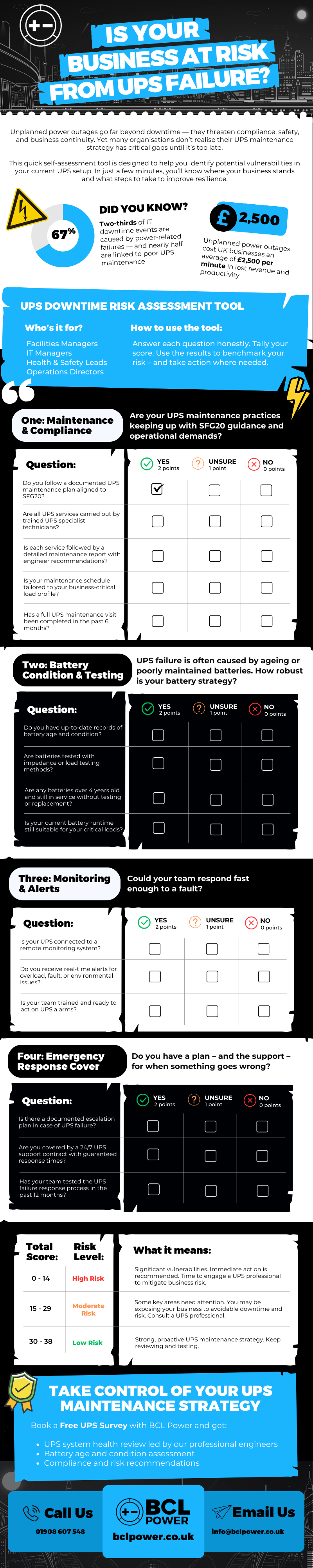 Use the infographic below to assess your UPS systems, and if your results reveal a risk, BCL Power is here to help. Book a free UPS survey today and get expert insight into the condition of your equipment, battery health, and overall maintenance strategy.